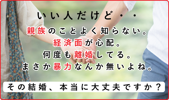 結婚を前提に交際している婚約者・交際相手に不安要素を感じた時 秘密裏に事実確認を行い結婚という大きな決断の検討材料としてご利用下さい。