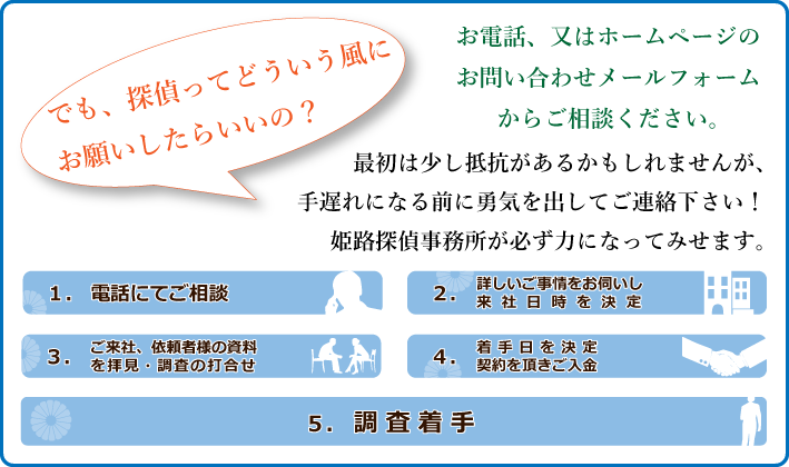 ご依頼から調査までの流れ 【まずはご相談ください】 電話: 079-273-5551携帯: 080-4232-5551 受付時間: 年中無休24時間 問い合わせフォームからも受付しております。 現在のお悩みをお聞かせ下さい。